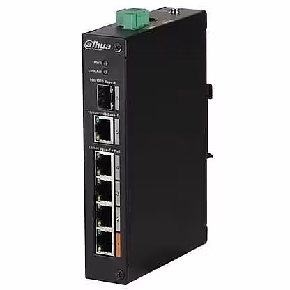 PoE Switch με 4 θύρες στα 100Mbps, 1 θύρα uplink στα 1000Mbps και 1 θύρα SFP (οπτική ίνα) για σύνδεση σε modem-router ή άλλο switch.